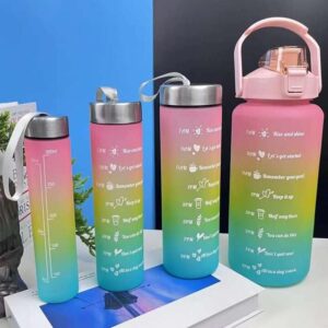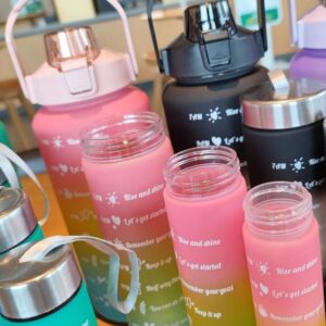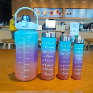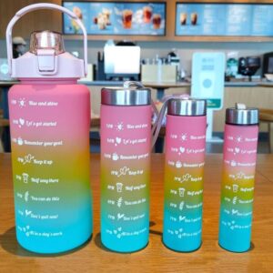 - The front of the bottles features motivational quotes, while the back displays capacity measurements.